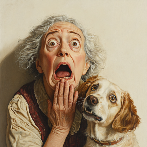old mother hubbard and her dog looking shocked scared afraid, plain cream background, in the style of hyperrealist, iconic pop culture caricatures, victorian genre paintings, highly staged scenes, humorous tableau