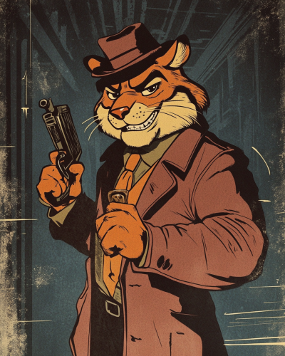 a mid-century comic book cover that is dark and moody showing the Frosted Flakes mascot, Tony the Tiger, dressed as a 1940s gangster, shadowed, bold lines, dark, --ar 4:5