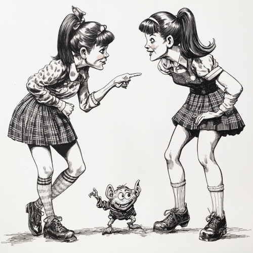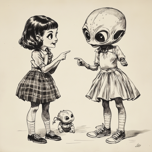 A black and white, detailed pen and ink illustration inspired by Mad Magazine, featuring two women in their 20s dressed as 1950s schoolgirls, leaning in close and whispering secrets to each other with mischievous smiles. One woman is pointing down at a dwarf-sized alien with a big head, resembling the alien from The Flintstones. Both women wear plaid skirts, tight sweaters, Chuck Taylor shoes, and frilly ankle socks, capturing a playful, slightly exaggerated style. The illustration has a blank background, emphasizing the characters and adding a humorous, satirical touch with expressive, bold pen and ink contrasts.
