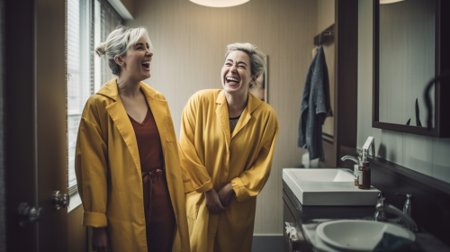 a hyper real photograph of a two women in an upscale bathroom and one is a doctor wearing a yellow lab coat. they are both smiling and surprised to see one another. --ar 16:9 --v 5.0 --s 750