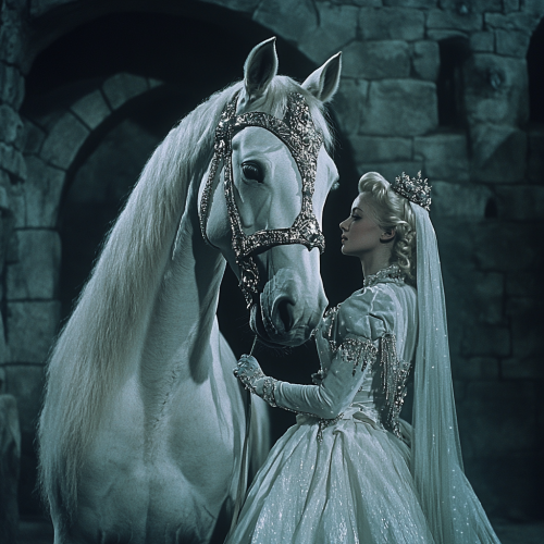 Low resolution screengrab of 1950's Super panavision 70 movie. Retro in colour. A humanoid figure with the head of a white horse dressed as a princess. The setting is a dark fantasy world --ar 1:1
