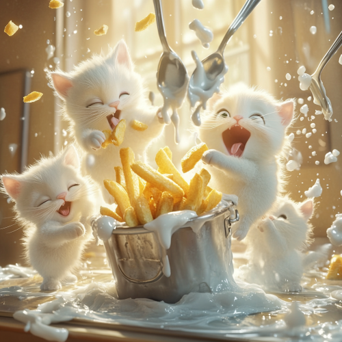 Pixar cartoon style Adorable white fluffy kittens causing mischief dipping McDonald's French fries in a broken commercial ice cream maker with spoons that's spilling ice cream everywhere