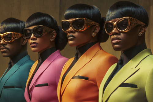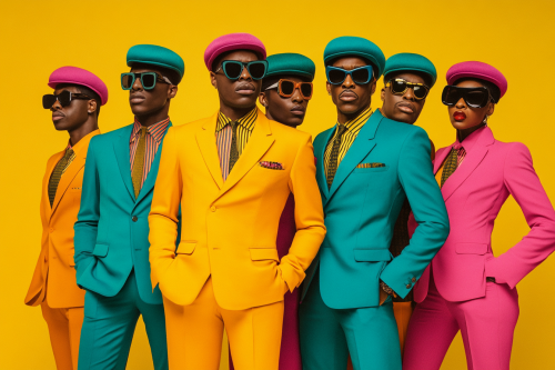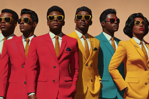 60s movie poster of 6 black men and women dressed in solid bright color mod superhero two-piece suit and dress uniforms, hyper detailed, sharp focus, highly detailed, ultra realistic texture --ar 3:2 --v 6.1