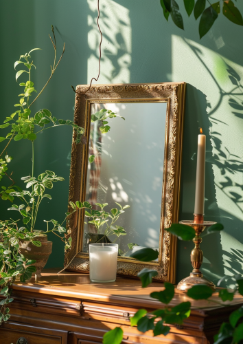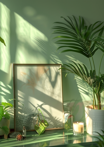 a very large empty photo frame and a candle on the center of a dresser; product shot; green interior with plants; lighting sunny and bright; Hyperrealistic. --ar 5:7 --style raw --v 6.0