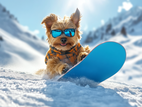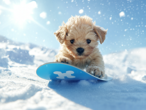 A cute Pekinesen puppy wearing is snowboarding down the hill, with a blue board in front of him. The background features a sunny winter day. High-resolution photography, insanely detailed, fine details, stock photo, professional color grading, hyper-realistic --ar 4:3
