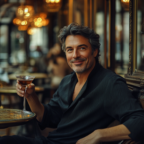 a 50 years old man, drinking a coctail martini in a historical caffe in Paris, wearing casual elegant dresses, he is smiling while holding is cocktatil. He has middle lenght grey and black hair. Hyper-real style.