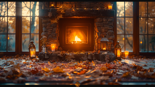 Ultra-realistic photo of a soothing, cozy interior, capturing the warmth and tranquility of an autumn evening spent by the fireplace. The room is softly lit by candles and lanterns, with warm tones of autumnal colors like deep oranges, browns, and golds. The flickering glow from the fireplace casts gentle shadows, creating an inviting atmosphere. The ambiance evokes the peacefulness of falling leaves, the gentle crackle of burning candles, and the comforting, reflective mood of a quiet, serene evening. 8k --ar 16:9 --s 750 --v 6.0
