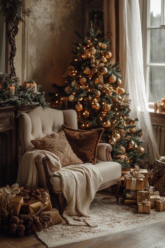 Create an image of a cozy corner that uses warm browns and creamy beiges to mimic the indulgence of Belgian chocolate for a deliciously inviting European style Christmas decor. The room should feature soft lighting, plush textiles, and touches of gold to enhance the cozy and appetizing theme. Ensure the photograph is professional and hyper-realistic, perfect for drawing viewers to explore more Belgian Chocolate-inspired Christmas decor ideas. Camera: DSLR - Canon EOS 5D Mark IV. Lens: Canon EF 24-70mm f/2.8L II USM. Composition: Wide shot, room-centered, horizontal orientation, balance between furniture and space. Film: Digital, high resolution, color profile sRGB. Camera settings: ISO 400, f/2.8, 1/60 sec. --ar 2:3 --v 6.1 --s 250