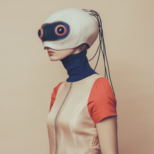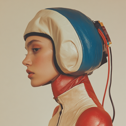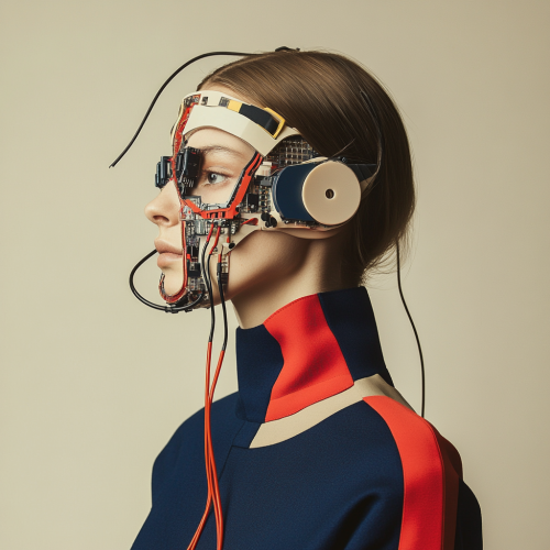 minimalistic disruptive strong futuristic extremely sophisticated photographs a pretty young fashion woman model half body highest quality shot has an outfit made completely with ultra technologic and synthetic textile, wears a weird electronics parts mask with a cable behind the head, hyperrealistic quality warm softbox light, dark blue and red colors, beige background, strange disruptive shapes avant-garde shape