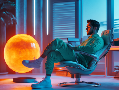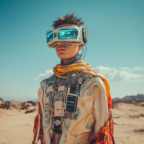 Minimalist Ultra realistic photography, Ultra detailled, minimalistic disruptive strong futuristic extremely sophisticated photography a pretty young fashion man model half body standing on desert planet background, highest quality shot has an outfit made completely with softest plastic wears, a weird inflated soft Teeshirt and technical wears with some visibles pieces of electronics, electronics made with waste composant system, with Electronics parts around his neck until his mind, hyperrealistic quality warm softbox light, colors blue, red, and beige and strange disruptive shapes avant-garde shapes