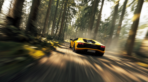 a lamborghini aventador driving through a northern european forest hill road, low perspective view point, spingtime, speed lines, hyper realistic --ar 16:9 --v 6.1