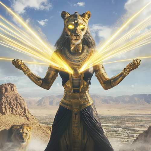 444 sekhmet goddesses as a lion pride in a real human bodies with the head of a real female lion alive hyper realistic shooting powerful yellow beams of light out of her eyes and hands. She stands at the north end of las vegas on the edge of piute land. with the city of las vegas off in the southern distance. she towers over the mountains las vegas and at her feet is the lion king simba.