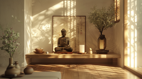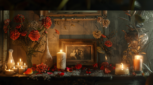an interior photo of a home altar; flowers and candles; in the center a photo frame; minimal interior design; Hyperrealistic. --ar 16:9 --style raw --v 6.0
