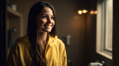 a hyper real photograph of a women with long dark hair in an upscale bathroom wearing a yellow lab coat. she is smiling, talking to someone off camera. We see her entire body in the frame. the lighting is bright and warm. --ar 16:9 --v 5.0 --s 750
