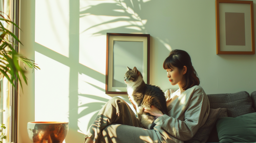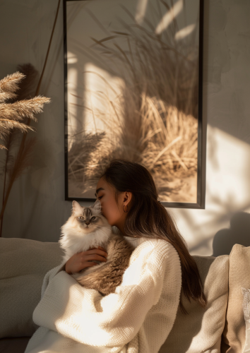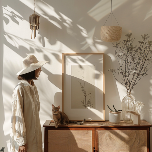 a large photo frame on the center of a wall; product shot; minimalistic interior; lighting sunny and bright; a woman holding a cat blurry in the front; Hyperrealistic. --ar 5:7 --style raw --v 6.0
