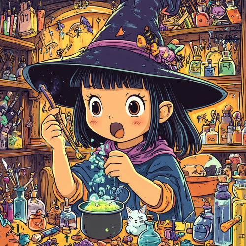 coloring book cover, cute kawaii cartoon style illustration of witch inside a house mixing potions, casting spells with a magic wand, surprised expression, a small cat nearby, surrounded by magic bottles and a cauldron, various colorful and uniquely shaped potion bottles scattered around, hyper realistic