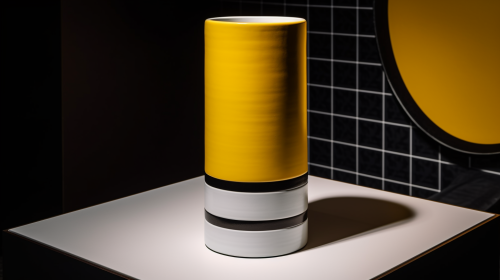 a hyper real still life photograph of a white cylinder tube is sitting on a black triangle pedestal. the background has a geometric pattern that is bright yellow, medium yellow, black. --ar 16:9 --v 5.0 --s 750