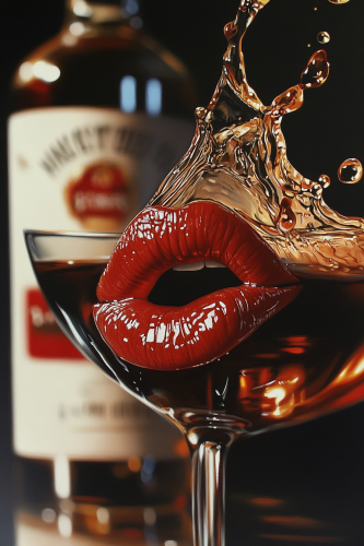 A hyper realistic image of red womans lips sipping Port liqued splashes that come out of a upright martini glass, with a typical port bottle background back --ar 2:3 --v 6.1