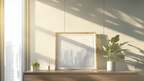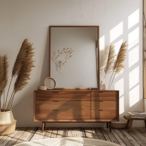 a large photo frame on the center of a dresser; product shot; minimalistic interior; lighting sunny and bright; Hyperrealistic. --ar 16:9 --style raw --v 6.0