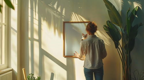 a large empty photo frame on the center of a wall; product shot; countryside interior; lighting sunny and bright; a woman holding a cat blurry in the front; Hyperrealistic. --ar 16:9 --style raw --v 6.0