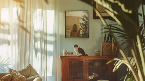 a large photo frame on the center of a wall; product shot; countryside interior; lighting sunny and bright; a woman holding a cat blurry in the front; Hyperrealistic. --ar 16:9 --style raw --v 6.0