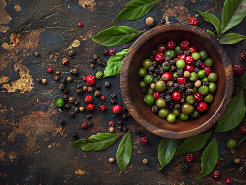 A hyper-realistic food art photograph featuring Kampot pepper in an elegant presentation. The scene shows freshly harvested green and red peppercorns arranged artfully on a dark rustic wooden surface, with scattered dried peppercorns and delicate pepper leaves adding to the visual texture. A traditional Cambodian wooden bowl filled with Kampot pepper is placed prominently, highlighting the artisanal quality. The lighting is soft and diffused, casting gentle highlights and shadows that enhance the texture of the peppercorns and the rough grain of the wooden surface. The overall composition conveys a sense of craftsmanship, heritage, and luxury. Created Using: DSLR camera with a prime lens, shallow depth of field, dark moody lighting, high-contrast tones, focus stacking technique, food photography style, hd quality, vivid detail --ar 4:3 --v 6.0 --s 250