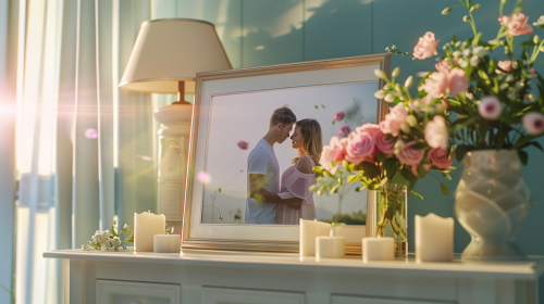 a large photo frame on the center of a dresser; product shot; flowers and candles; lighting sunny and bright; Hyperrealistic. --ar 16:9 --style raw --v 6.0