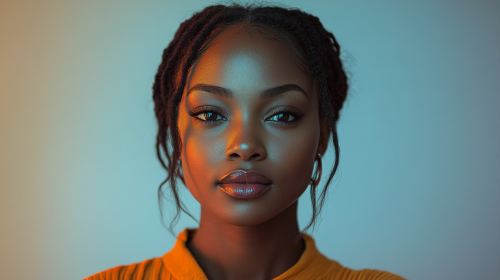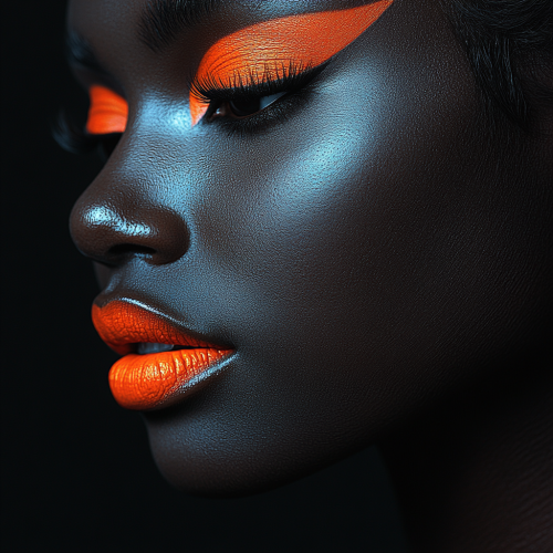 A hyper-realistic, high-contrast profile portrait of a woman with dark, smooth skin, illuminated to highlight her facial features. The woman has strikingly bold, vibrant orange makeup, with eyeshadow that sharply accentuates her eyelids and lips painted in the same vivid orange shade, creating a visually striking contrast against her deep skin tone. The lighting casts gentle shadows, enhancing the smooth texture of her skin, while the highlights accentuate the curves of her nose, lips, and cheekbone. The background is a solid, bright turquoise color, providing a clean and modern contrast to the dark and vivid tones of the portrait, making the image pop. The woman's eye is focused forward, with long, defined eyelashes that add to the sharpness of the look. The overall aesthetic is bold, sleek, and futuristic, emphasizing minimalism with a strong emphasis on color and texture contrast. The composition captures a sense of elegance and intensity, with the precise lighting adding depth and dimension --s 750