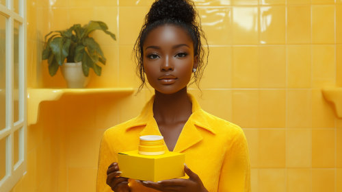 a black woman in an upscale bathroom with a yellow lab coat is holding a yellow cardboard box open. The box is medium sized and inside is a cylinder of face cream ; Annie leibovitz style photo, high tonal contrast, hq colour photo set, arches, vogue velvet, iridescent, holographic, full pose, transparent details, colourful, photorealistic, highly detailed, transparent parts, looks like a professional hdr photograph in a fashion magazine, editorial photography, global lighting mood lighting, post-processing, glowing shadows, chromatic aberration, black and white balance, dispersion, beautiful cinematic lighting, lumen reflections, post-production, high-fashion, tone mapping, shaders, 3d diffraction gradation, octantian rendering, detailed, hyper-realistic, 16K, --ar 16:9 --stylize 750 --v 6.1