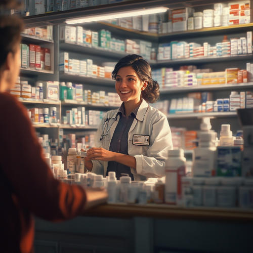 A hyperrealistic scene of a busy pharmacy technician behind the counter surrounded by shelves of medications, interacting with customers with a smile, mid-day setting, vibrant lighting, candid shot, subtle depth of field.