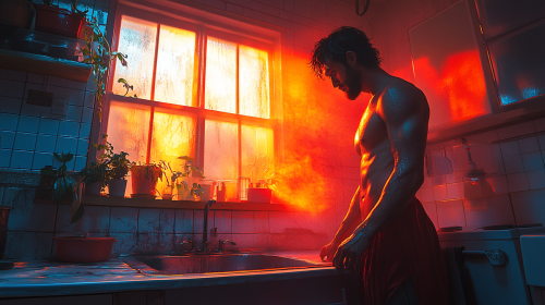 a plain colour line print of Captain America doing the dishes, to be contrasted, vertically ; Annie leibovitz style photo, high tonal contrast, hq colour photo set, arches, vogue velvet, iridescent, holographic, full pose, transparent details, colourful, photorealistic, highly detailed, transparent parts, looks like a professional hdr photograph in a fashion magazine, editorial photography, global lighting mood lighting, post-processing, glowing shadows, chromatic aberration, black and white balance, dispersion, beautiful cinematic lighting, lumen reflections, post-production, high-fashion, tone mapping, shaders, 3d diffraction gradation, octantian rendering, detailed, hyper-realistic, 16K, --ar 16:9 --stylize 750 --v 6.1