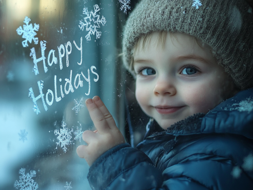 "Happy Holidays" lettering handwritten by a child on a transparent window with a blurred winter blue background. He also drew some stars on the window. Xmas, Hyper realistic, hyper detailed. high-resolution photography. photographed by art director. --ar 4:3 --style raw --v 6.1