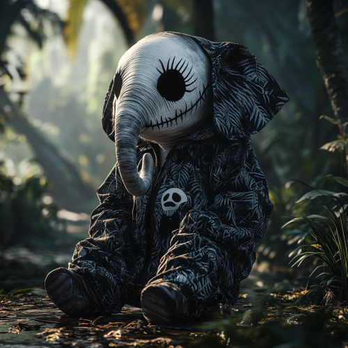 Hyper realistic image of a elephant cosplaying in a Jack Skellington onesie, jungle in the background. Shadows. Lights. HDR. Ray-tracing. 64K realistic
