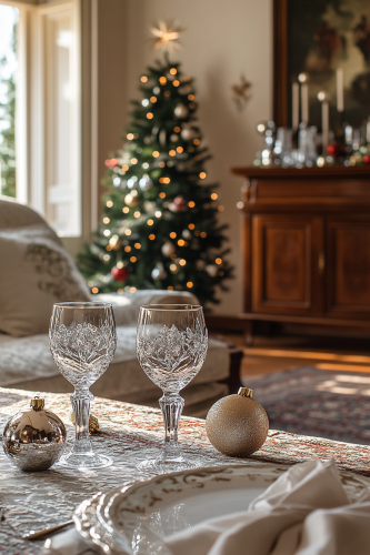 Capture a full view of a living room adorned with delicate Czech glass ornaments and sparkling decorations for a refined European style Christmas decor. The room should feature elegant glass pieces, translucent accents, and a sophisticated color palette that highlights the exquisite craftsmanship of Czech glass. The image should be organized and captured in a hyper-realistic manner, as if taken with a high-end DSLR camera, inviting viewers to discover more about the sophisticated and elegant Czech Glass Ornament Christmas decor ideas. Camera: DSLR - Canon EOS 5D Mark IV. Lens: Canon EF 24-70mm f/2.8L II USM. Composition: Wide shot, room-centered, horizontal orientation, balance between furniture and space. Film: Digital, high resolution, color profile sRGB. Camera settings: ISO 400, f/2.8, 1/60 sec. --ar 2:3 --v 6.1 --s 250