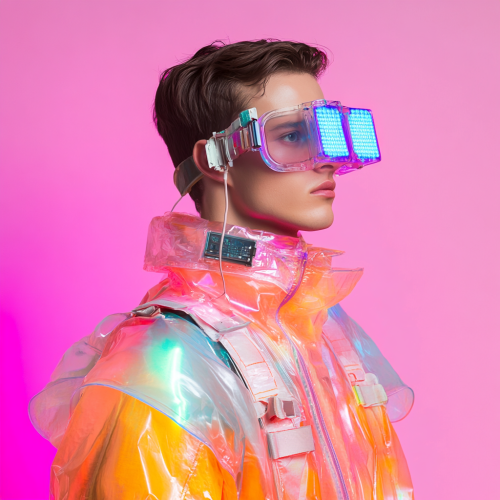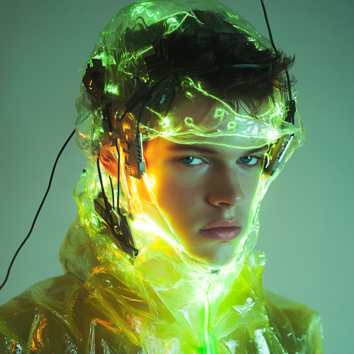 Ultra realistic photography, Ultra detailled, minimalistic disruptive strong futuristic extremely sophisticated photographs a pretty young fashion man model half body front view highest quality shot has an outfit made completely with fluo liquid shape wears a weird inflated shapes and technical wears, some pieces of electronics hyperrealistic on his head, quality warm softbox light extremely vibrant fluo luminated colors and transparencies strange modern disruptive shapes avant - garde shapes