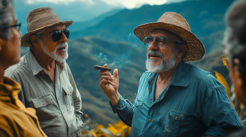 a group of mid-thirties aged gentleman, standing on a mountain view in a circle in Nicaragua smoking a cigar, looking happy, socializing, dark background cinematic lighting with deep shadows, soft cold tones, and a vintage film look, hyperrealstic, photorealistic --ar 16:9 --stylize 400