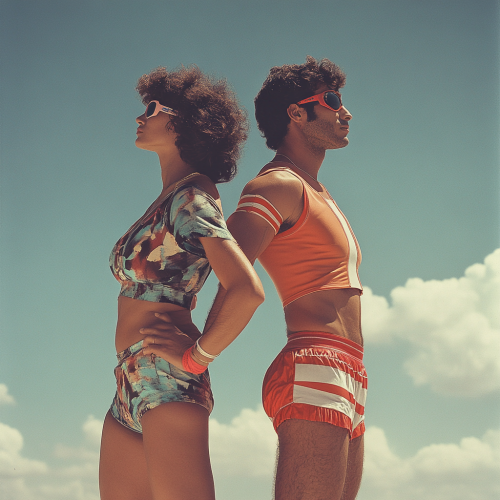 Hyperalistic photograph of a trained Israeli man and woman wearing sports clothes, in the 70's standing back to back looking at the horizon with a look full of power
