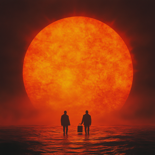 a group of adult men, sitting around with a view of mountains in the distance of Nicaragua, smoking cigars, telling stories, socializing, one if them standing up, sunset background cinematic lighting with deep shadows, soft cold tones, and a vintage film look, hyperrealstic, photorealistic --ar 16:9 --stylize 400