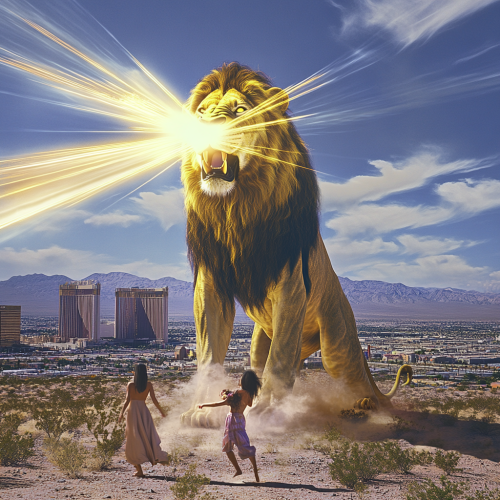 777 female lions as sekhmet goddesses as a lion pride in a real human bodies with the head of a real female lion alive hyper realistic shooting powerful yellow beams of light out of her eyes and hands. She stands at the north end of las vegas on the edge of piute land. with the city of las vegas off in the southern distance. she towers over the mountains las vegas and at her feet is the lion king simba. there is a woman and her child running in fear into the hands of anubis far off in the distance.