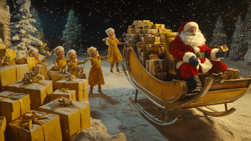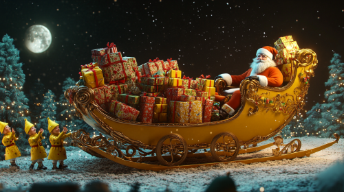 A hyperealistic Christmas scene with Santa Claus dressed in yellow sitting on a yellow sleigh on the right side. The sleigh should have intricate designs and details, with the packages wrapped in festive paper of varying colors. In the center of the image, the back of the sleigh is visible, filled with various-sized packages neatly stacked. On the left side, there are two elves dressed in yellow, carrying a box to the sleigh. Their faces are not visible due to their position. The background should be a night scene illuminated by the moonlight, reflecting softly on the sleigh and packages. --ar 16:9