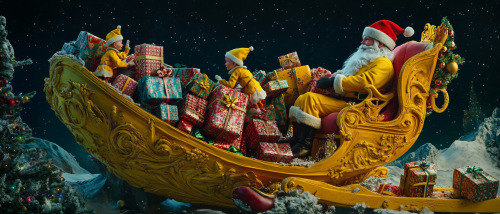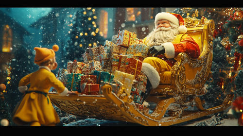 A hyperealistic cinematographic Santa Claus dressed in yellow sitting on a yellow sleigh on the right side. The sleigh should have intricate designs and details, with the packages wrapped in festive paper of varying colors. In the center of the image, the back of the sleigh is visible, filled with various-sized packages neatly stacked. Towards the back, two small elves dressed in yellow are cheerfully helping load more small boxes onto the sleigh, actively lifting and passing them. The background should be a night dark scene,. --ar 7:3