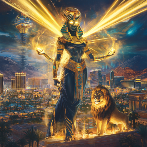 sekhmet goddess alive hyper realistic shooting powerful yellow beams of light our of her eyes and hands. She stands over the city of las vegas and at her feet is the lion king simba.
