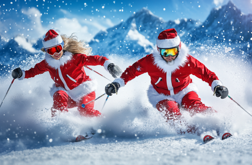 A male and female skier in an christmas outfit is skiing down the mountain, leaving behind clouds of snow and powder. The snowy mountains are in the background, and the wide-angle shot captures the sunny day and bright colors. The image was shot with a Sony Alpha A9 II and a Sony FE 200-600mm f/5.6 G OSS lens, using natural light. The result is a hyper-realistic, ultra-detailed photograph. --ar 38:25