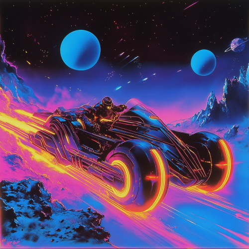 dark fantasy 80s neon glow colors,Tron the movie a intergalactic futuristic motorcycle heavily armored speeding on it in deep space , surrounded by meteors and planets, a surrealistic painting with black outlines, from dark, dark fantasy, it has a dark blue gradient sky, there should be mountains of earth that turned into dust, hyper realistic - - v6.1