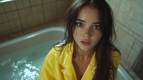 photograph of a woman with long brown hair in a bright yellow lab coat is standing in an upscale bathroom with a surprised look on her face. she is looking at someone off camera. detailed, hyper-realistic, cinematic lighting. 16K, --ar 16:9 --stylize 750 --v 6.1