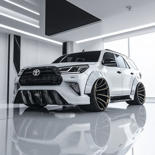realism of elegance 2025 toyota fortuner modified, changes in the bumper and grilles with small but neat particles, hyper detailed, contrast white color, front-side angle, parked inside white garage