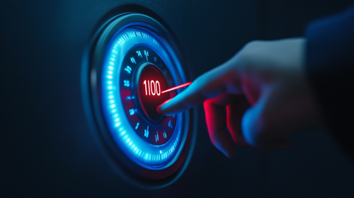 3/4 angle. Hand turning a glowing blue button. Next to the button there is a dial and in the dial there are numbers going from 0 to 100 and a red hand points to the number 100. Below the dial there is space to write text . Concept image business. Minimalist. Professional photography, Hyper realistic, hyper detailed. high-resolution photography. photographed by art director. --ar 16:9 --style raw --v 6.1