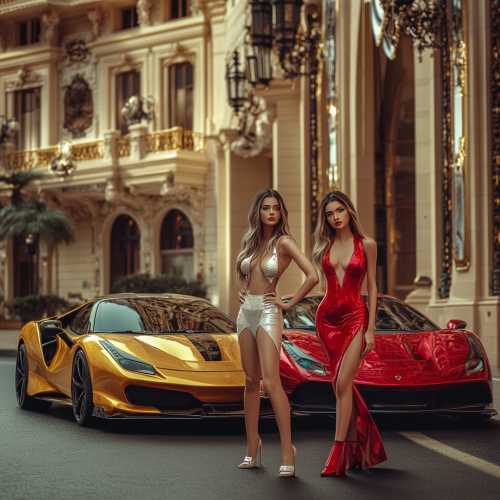 two beautiful female models posing with hypercars in monaco outside the casino. One car is to be a ferarri and the other a lamborghini. ultra realistic ar 16:9