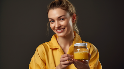 hyper real photo of a woman in a studio setting. she is wearing a bright yellow lab coat holding up a small jar of face cream. She is looking at camera smiling. --ar 16:9 --v 5.0 --s 750