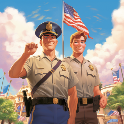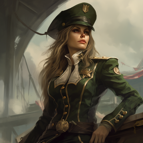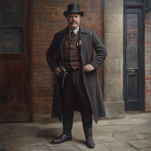 A police officer in San Francisco in 1870 would present a distinctive appearance that reflected the fashion of the time. Physically, he might be of average height, with a robust build, showcasing the strength needed for his job. His face could be marked by the hardships of street work, with a square jaw and a determined gaze. In terms of clothing, the uniform would consist of a dark wool jacket, fitted to the body, with shiny metal buttons and a high collar. He would wear matching trousers, slightly loose, which would fit into black leather boots. A wide-brimmed hat, typical of the era, would complete his outfit, providing protection from the sun. Additionally, he might sport a badge on his chest identifying him as a law officer. For nights or adverse weather conditions, he could have a long wool coat, which would lend an air of authority and respect. This ensemble would not only make him stand out on the streets of San Francisco but also reflect the seriousness and commitment of his duty in a growing city full of challenges.